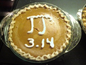 Finally, just to give you an idea of the kind of house I live in: late last week, our matehmatically-inclined daughter Madi pointed out that Sunday, March 14 was officially Pi Day (3/14).  To mark the occasion, then, Barb made three pies — apple, pumpkin, and chocolate pecan — and decorated them accordingly.  Here’s the pumpkin pie, for example, just before we tore into it: