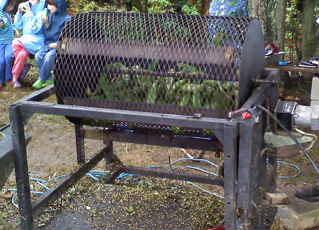 Each year, the Washington DC branch of the University of New Mexico Alumni Association hosts its annual chile roast at a farm deep in central Maryland. They bring in over a ton of fresh green chile — right out of Hatch, New Mexico, naturally — and set up roasters. Like so:
