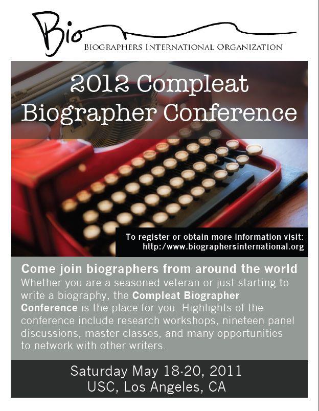 Biographers International Organization — the world’s premiere group of biographers and lovers of biography — is holding its third annual conference this May, at the University of Southern California in Los Angeles. There’ll be panels of research and writing, interviewing and negotiating, and even a bit of sex and violence. Yeah, really. And all brought to you by a crack team of biographers, including Charles J. Shields, Richard Schickel, Will Swift, Jonathan Eig, Kate Buford, and Pulitzer Prize winner Debby Applegate.