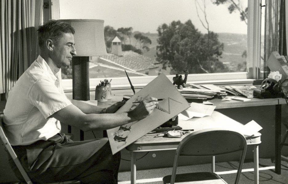 Theodor Seuss Geisel at desk. La Jolla, CA. Shot of Look Magazine.