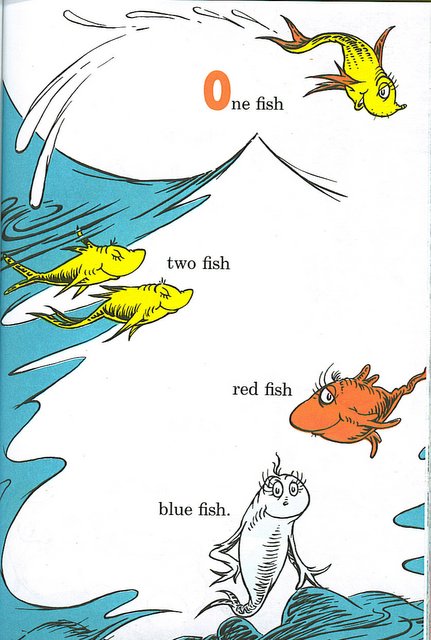 Among the first books Dr. Seuss produced for the Beginner Books imprint was One Fish Two Fish Red Fish Blue Fish, completed in 1959. One Fish was an experiment for Seuss, as he was deliberately using an even more restrictive word list of short words, and placing the accompanying drawings as close to the text as he possibly could, like so: