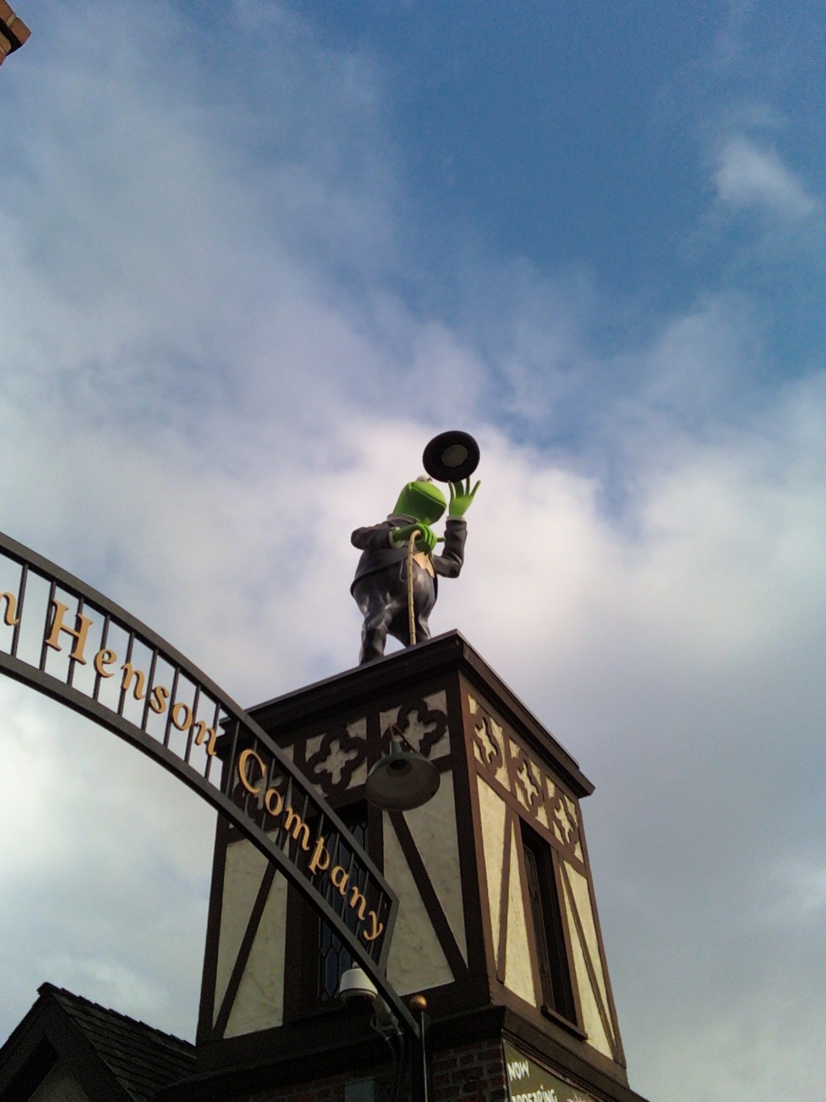 As you can see, as a tribute to Chaplin, there’s a statue of Kermit in Chaplin’s trademark derby and baggy pants just beside the entrance. Here’s a somewhat better picture, taken from just outside the front gate: