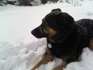 Despite her deteriorating physical condition, she was as spirited, social, and loving as ever. When we sat in the living room to watch television or read, she would drag herself across the floor so she could lay in the middle of things. When the enormous snowstorm crashed through the area, she would lay for hours in the spot we had cleared in the back yard, eating snow and watching the birds dive at the birdseed we had thrown out. As the sun melted the snow and warmed the ground, we would look out the kitchen window and see her sleeping contentedly in the sun, sprawled out full length.