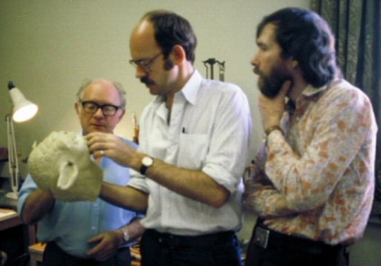 Lucasfilm builder Stuart Freeborn consults with Frank Oz and Jim Henson on a model for Yoda.
