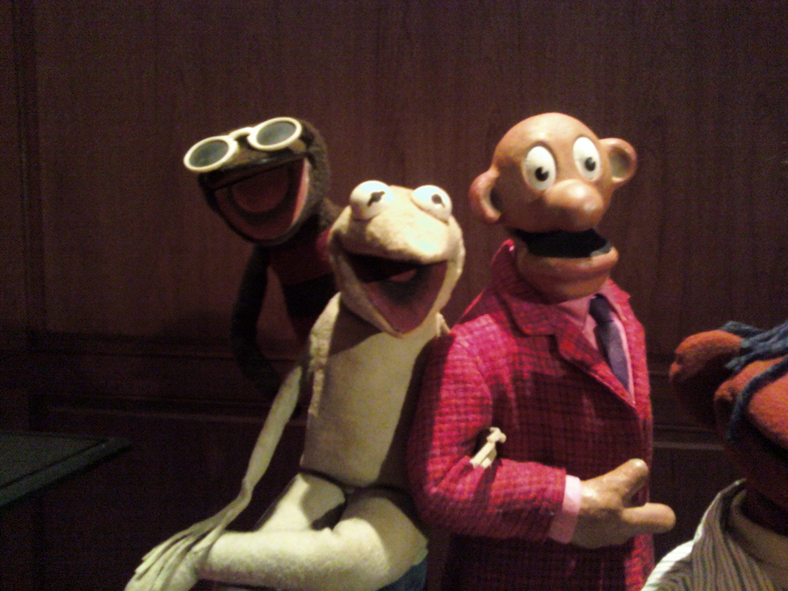 The fact that Sam and Friends was Jim Henson’s springboard onto the national scene already makes it worthy of inclusion in the Smithsonian. But Sam had more going for it than even that — for among its cast members was a milky-green puppet named Kermit. He wasn’t a frog then, and wouldn’t be for several years. But his simple design gave him enormous versatility as a puppet, and he quickly became Henson’s go-to character. Kermit would be revamped and overhauled in the coming years, eventually becoming (in Henson’s words) “frogified,” but the basic design held. Take a look at him here, posing with Harry the Hipster on the left and Sam on the right (I snapped this with my camera phone, and I apologize in advance for its shakiness):